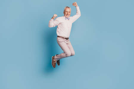 Full length photo of cheerful happy old man raise hands positive mood isolated on pastel blue color background