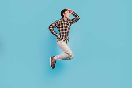 Full body profile side photo of young guy look forward ahead sale jump up isolated over blue color background