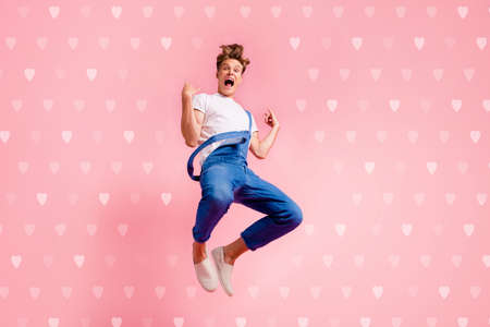 Full length body size view of nice attractive crazy cheerful cheery glad brunet guy artist jumping having fun showing copy space best solution isolated pink pastel color background