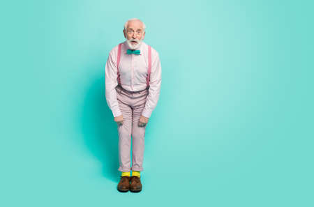 Full length photo of crazy astonished old man show his bright shine socks hipster look impressed scream unbelievable wear stylish vintage outfit footwear isolated green color background