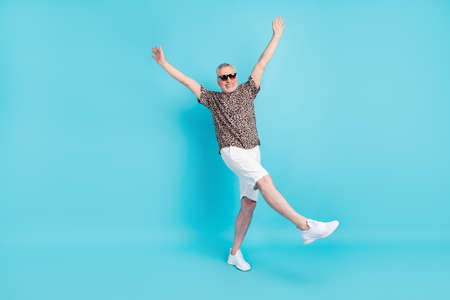 Photo of impressed man pensioner dressed khaki shirt arms hands spectacles jumping high isolated grey color background