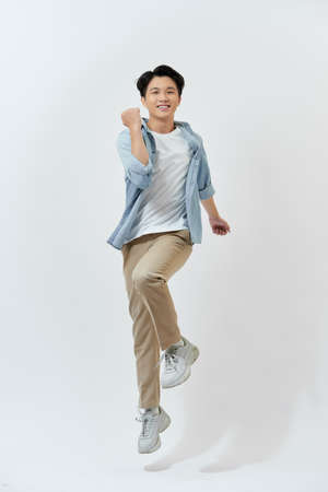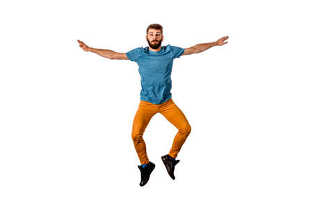 handsome man dressed casual jumping and smiling - dynamic wide angle shot