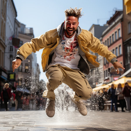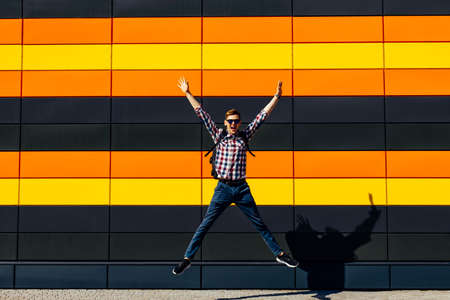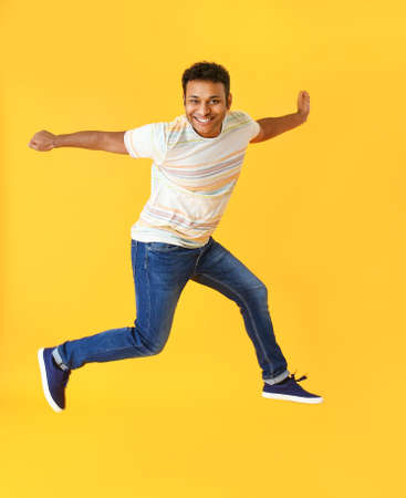 Happy young man jumping in front of vibrant yellow wall with exuberant energy and joy