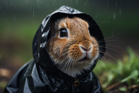 Rabbit wearing raincoat and raincoat in the rain. Animal concept.