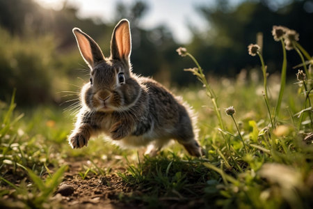 A happy bunny hopping through a meadow. AI generated illustration