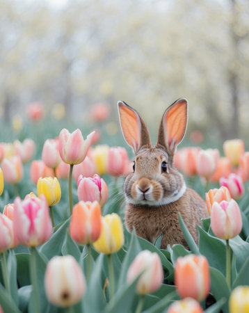 AI Generated. Ears of a Rabbit Peek out From a Colorful Bed of Tulips in a Serene Garden Setting