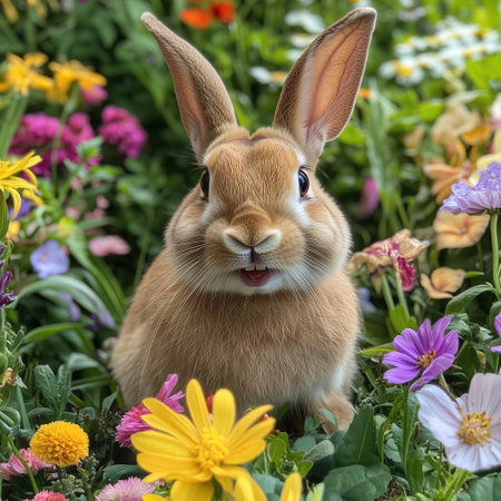 A rabbit with a big toothy smile, sitting in a garden surrounded by colorful flowers