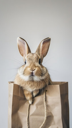 Cute brown rabbit peeking out of a paper bag with neutral background, adorable pet concept.