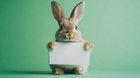 A charming Easter bunny is seen holding a blank white rectangular sheet of paper. The vibrant green backdrop creates a lively atmosphere perfect for seasonal greetings or announcements.