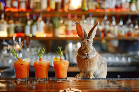 Rabbit sitting at the bar with carrot juice cocktails.