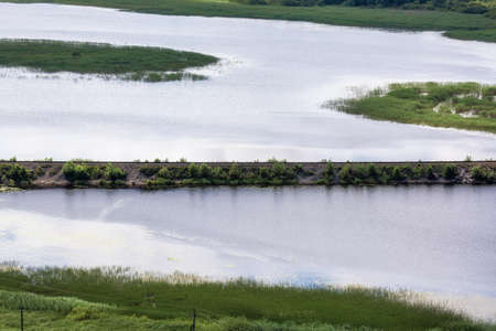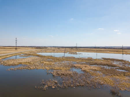 Aerial view of a marshland near a highway with an asphalt road during a spring flood, which floods and blurs the road under a clear blue sky without clouds. Natural disasters of the environment.