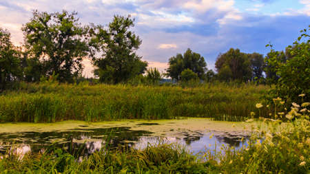 Sunny evening and pond with plants. Summer beautiful landscape. Russian nature.