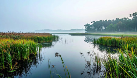 Quiet marsh with mirror still reflections soft reeds misty mood wide upper copy area representing tranquil wetland habitat and reflective calm suitable for conservation features travel guides and serene branding