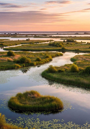A serene landscape of winding waterways through lush green wetlands at sunset
