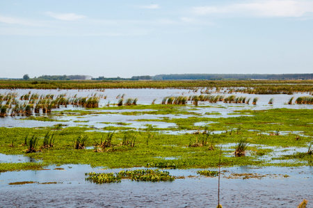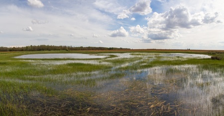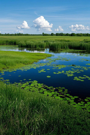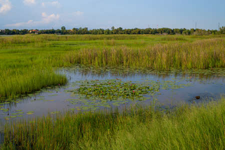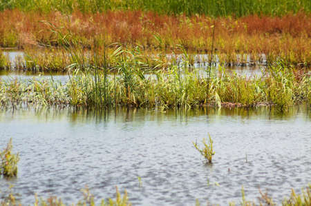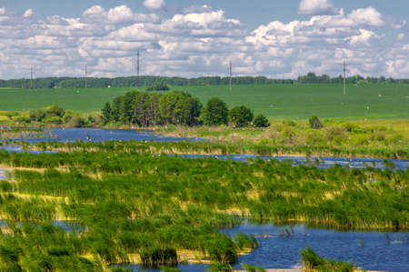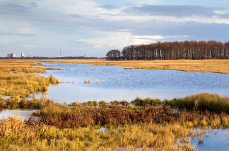 Landscape of a swampy pond with a reflection on the water. Blue sky horizontal photo.