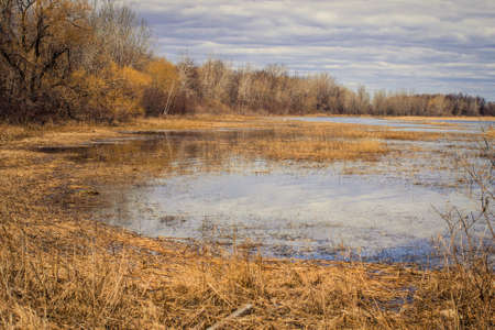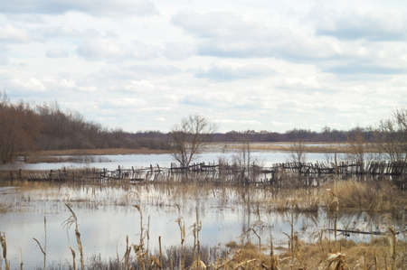 April cloudy landscape in flood of the river. Spring flood. Flooding meadows farms yard fence and gardens underwater