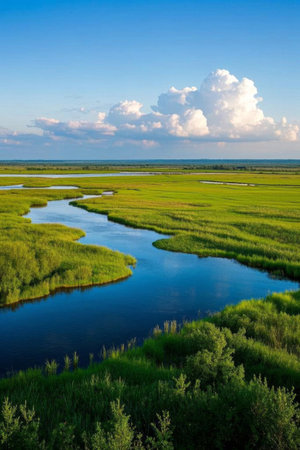 A breathtaking aerial view showcasing a vibrant river winding through lush wetlands. The scene captures the essence of natural beauty and serene landscapes filled with rich greenery and wildlife.
