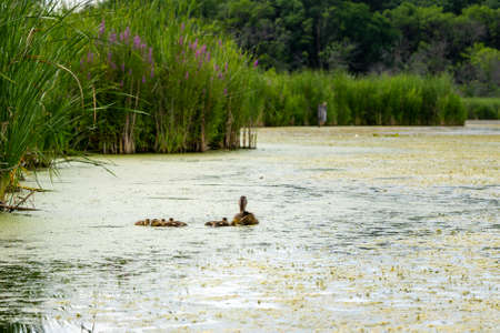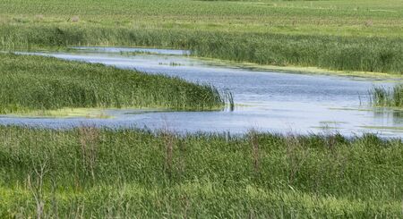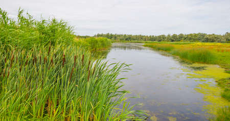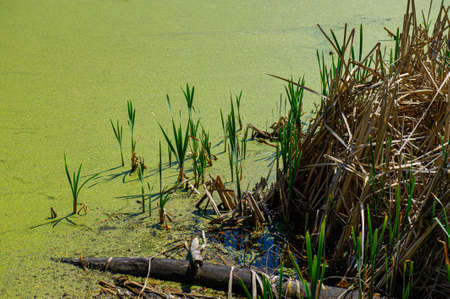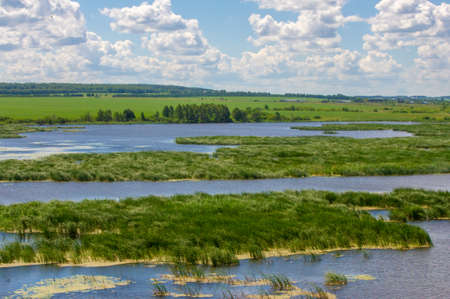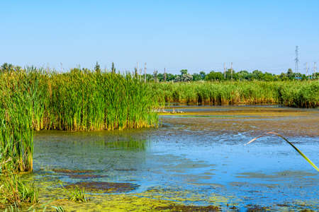 summer photography, a river overgrown with reeds, blue sky with white clouds, blue water covered with duckweed, river floodplain, sultry summer day