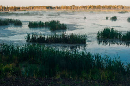 Scenic view from swamp, morning landscape with fog over a small forest lake and swamp at summer morning.
