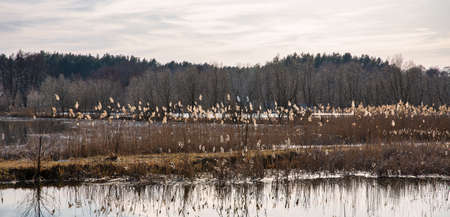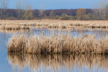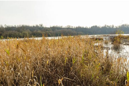 Banner natural autumn landscape river Bank dry grass reeds water nature. Selective focus blurred background