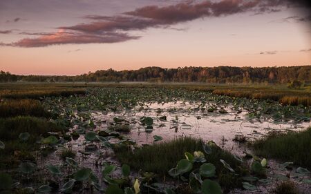 The Horicon Marsh comes alive at sunrise with calm waters reflecting the sky. Birds glide gracefully overhead as lush greenery surrounds the serene landscape.