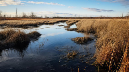 prairie landscape featuring grasses and marshes captured by john mccaw. this nature photograph, taken with the tokina at-x 11-16mm f2.8 pro dx ii lens, showcases calm waters, a mix of manapunk, dark brown, and sky-blue hues. the image beautifully portrays industrial landscapes with flowing brushwork, resulting in a high-definition visual experience. ai generated