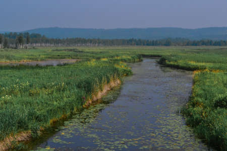 Summer river flows among grassy green banks and trees on the horizon. Morning, haze, slight fog. Russian landscape. Leaves in water