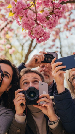 Diverse tourists, mixed gender and age, are clustered in a city park taking photographs of low-hangi