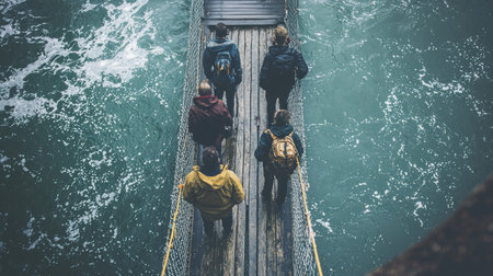 A group of people walking across a wooden bridge over a river, adventure travel concept.