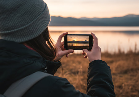A woman with long dark hair, wearing a gray beanie and dark jacket, takes a photo of a beautiful sunset over a lake with a smartphone. Generative Ai