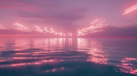 This captivating image captures a serene twilight scene over calm waters, featuring artistic light trails in the sky that reflect beautifully on the ocean surface.