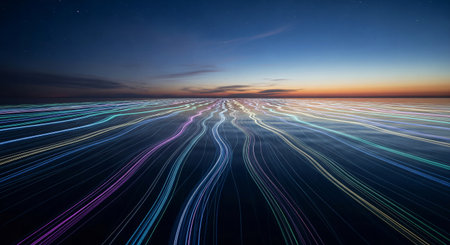 Multi-Colored Digital Light Trails Streaking Across the Surface of the Ocean at Twilight