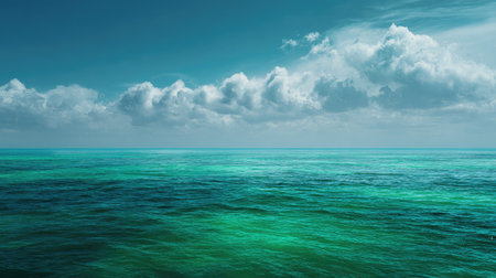 This striking ocean scene showcases calm waters with various shades of blue and green, beneath a sky filled with fluffy clouds, creating a serene atmosphere.