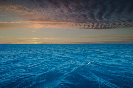 Colorful sunset over evening sea horizon, clouds sky. Tranquil scene. Natural background. Landscape. View from yacht