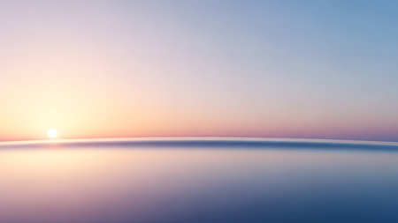 A minimalist sunset over a calm ocean with a soft gradient sky and gentle reflections on the water's surface.