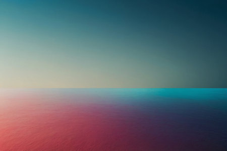 Abstract minimalist composition featuring soft, blurred color gradients transitioning from a deep cyan or blue at the top through lighter pinks and reds near the center, meeting a subtly reflective lower area suggesting water or a flat plane during the low light of dawn or dusk.