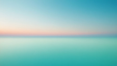 A blurred horizon line divides calm aqua water from a soft pastel sky, creating a serene and minimalist seascape...