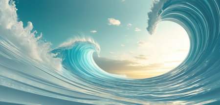A breathtaking view of a powerful ocean wave captures the moment just before it crashes, creating a stunning circular tunnel of water. The vibrant blues and whites of the wave contrast beautifully with the soft golden light peeking through, evoking a sense of awe and tranquility in natures raw beauty.