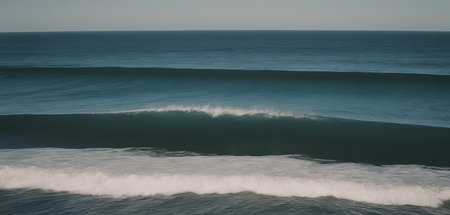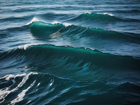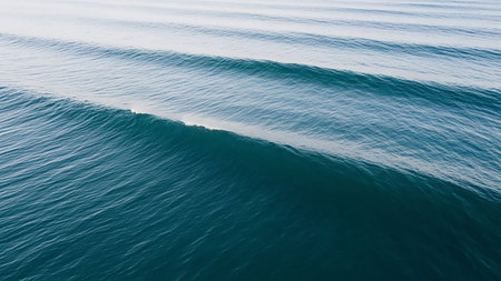 An aerial view of deep blue ocean waves with subtle ripples and a cresting wave, showcasing the serene and tranquil beauty of the sea's surface.