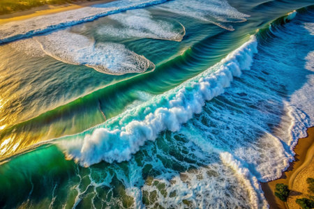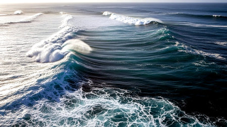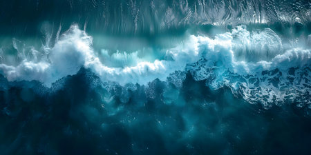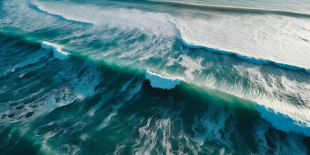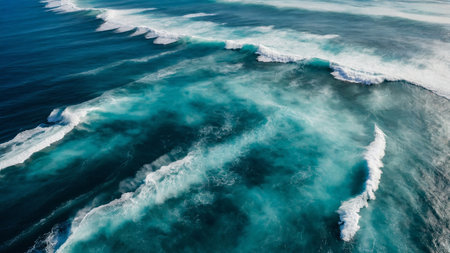 This stunning image captures the mesmerizing aerial view of the ocean with strong waves crashing, appearing in vibrant turquoise hues and dynamic patterns, showing the sheer power and beauty of nature's forces. AI generated image