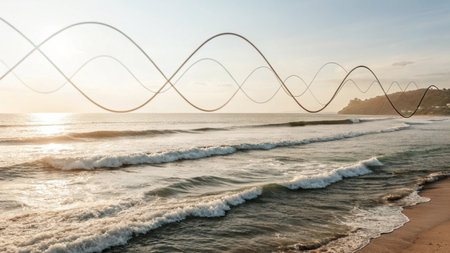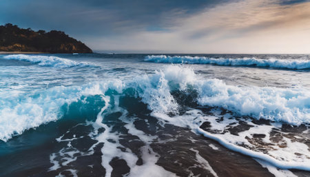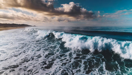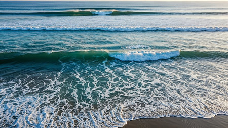 A mesmerizing scene of foamy ocean waves gently rolling toward the shoreline, illuminated by warm sunlight, showcasing natures rhythm, fluidity, and timeless allure in a harmonious seaside