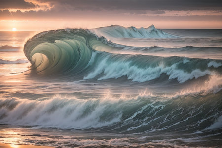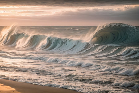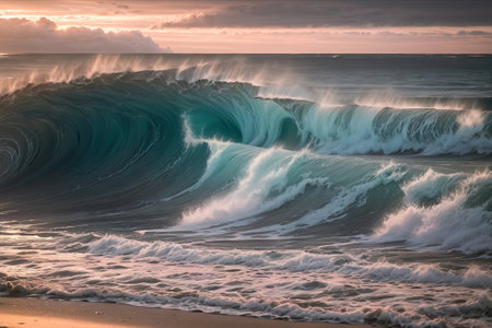 Natural showing ocean waves rolling in with a clear, dark teal color and foamy white crests under a soft pastel sky at sunrise or sunset keywords: ocean, waves,...