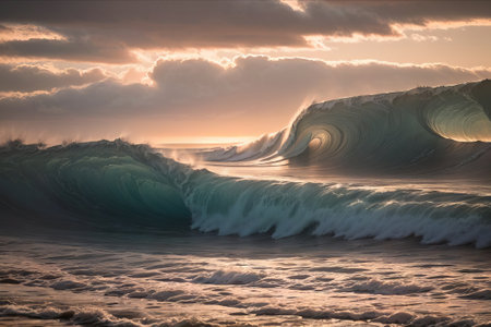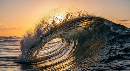Close-up of a powerful ocean wave cresting and breaking at sunset or sunrise. Golden light illuminates the water's movement and intricate patterns, showcasing nature's beauty and dynamic energy.