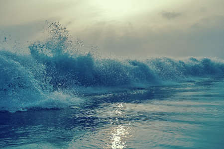 Ocean wave at sunset time. Blue ocean wave with sunbeams
