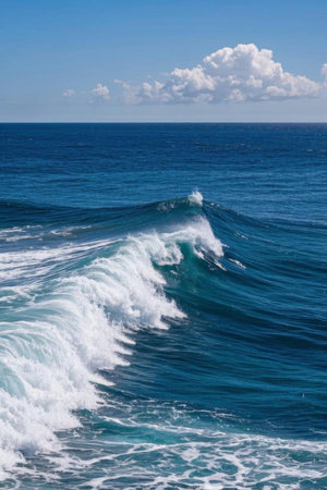 Outdoors showing deep blue ocean waves crashing under a clear sky keywords: ocean, sea, water, waves, ocean waves, sea waves, crashing waves, ocean surface, sea surface, blue, deep blue, clear...