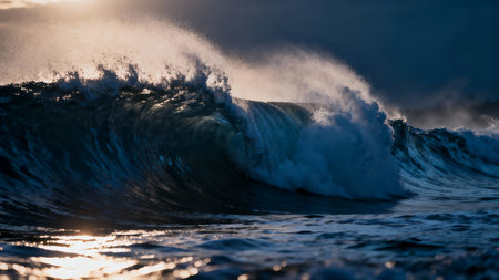 Powerful ocean wave cresting and curling with sunlight illuminating the water and creating a dramatic dark effect.