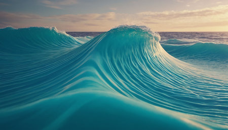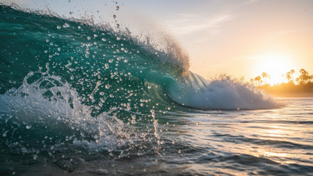 An ocean wave crests, showcasing clear, turquoise water under a warm, golden sunset. The image displays dynamic movement and textured water drops. The composition offers a scenic, natural setting, potentially suitable for travel, environmental, or commercial content illustrating the sea.