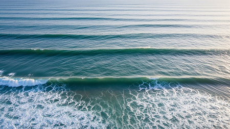 Towards showing aerial view of calm ocean water with distinct parallel waves and white foam lines stretching towards the horizon under a pale sky. resolution...