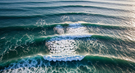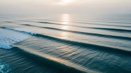 Grouped ocean waves break in uniform lines, capturing the morning light. The scene highlights the beauty of nature's patterns along the tranquil coastline at dawn.