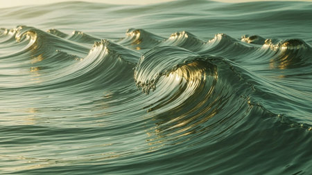 Golden showing close-up of gentle ocean waves with golden sunlight reflections. resolution